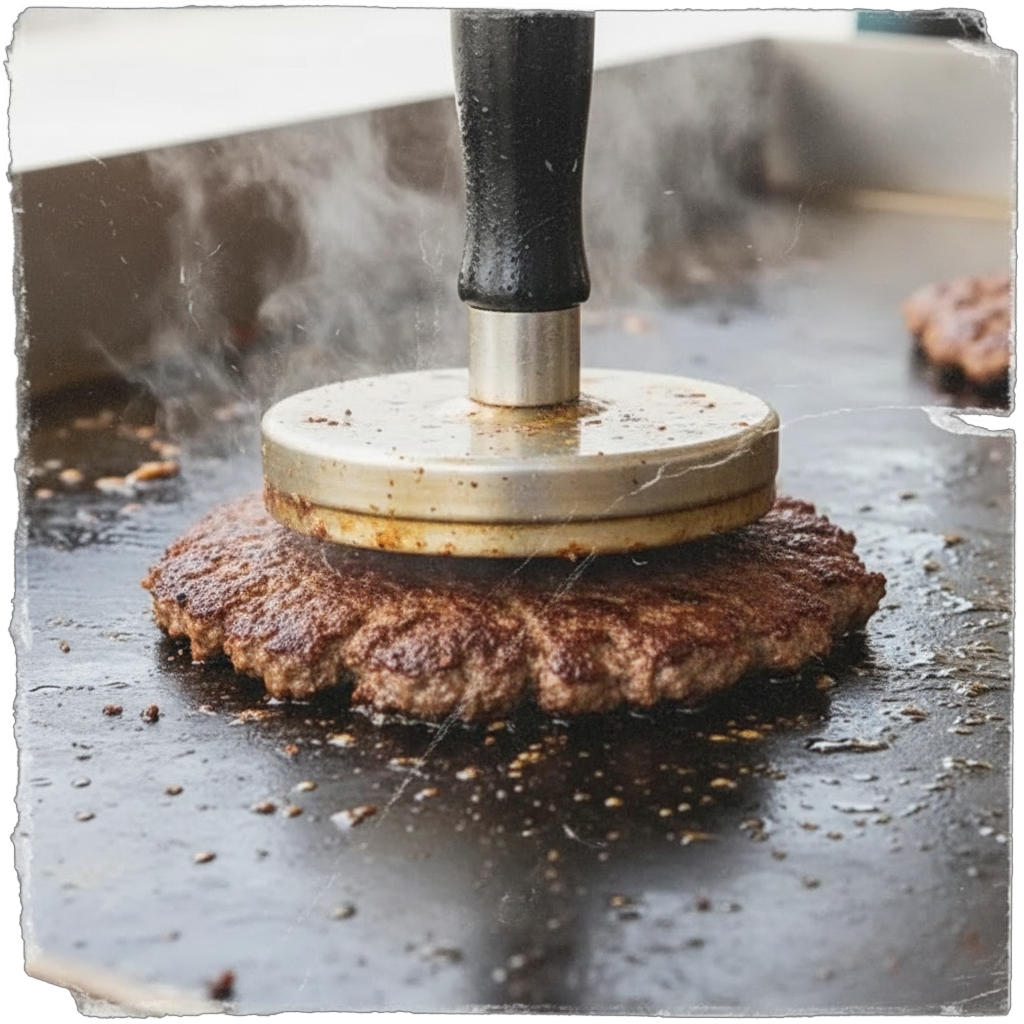 Das Patty wird mit Druck auf die heiße Platte gepresst. So entsteht eine Kruste voller Röstaromen, während das Innere saftig bleibt.